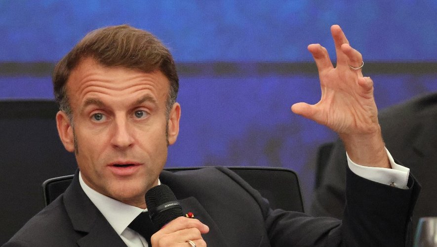 France's President Emmanuel Macron speaks during the Leaders’ Round Table to launch the Tropical Forest Forever Facility (TFFF) in the framework of the COP30 UN Climate Change Conference in Belem, Para State, Brazil, on November 6, 2025. (Photo by Ludovic MARIN / AFP)