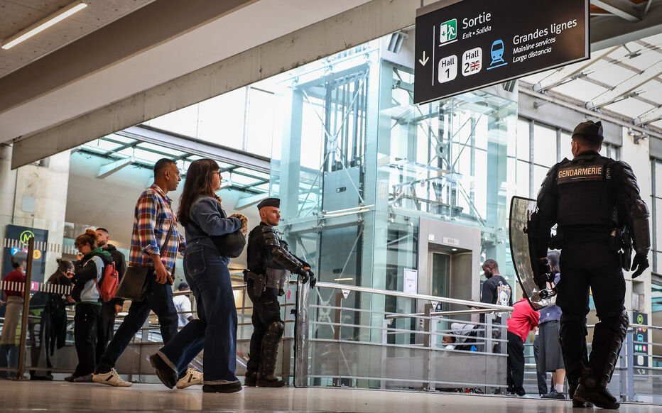Paris (1er), le 10/09/2025 Perturbations dans les transports en commun franciliens à la suite du mouvement "Bloquons tout" Ici les forces de l'ordre étaient nombreuses autour et dans la gare du Nord afin d'empêcher les manifestants d'envahir les voies. Photo LP / Fred Dugit